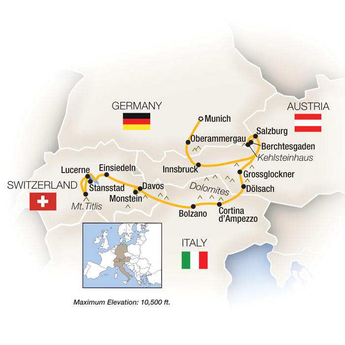 This active journey of 1,100 miles (1,609 km) through the Alps requires you to be in good health and able to walk reasonable distances often over unpaved and uneven surfaces; highest elevation on this tour is 10,500 ft (3200 m) on the excursion to Mt. Titlis. Some of the most memorable sightseeing can only be accomplished on foot. The amount of walking you do, however, is at your discretion. Germany, Switzerland, Italy and Austria are home to innumerable historic buildings and sites, many centuries old. Therefore, roads, walkways and architecture will present difficulties for some guests with physical limitations. You will encounter cobblestone streets, narrow passageways, and some steep and winding staircases.